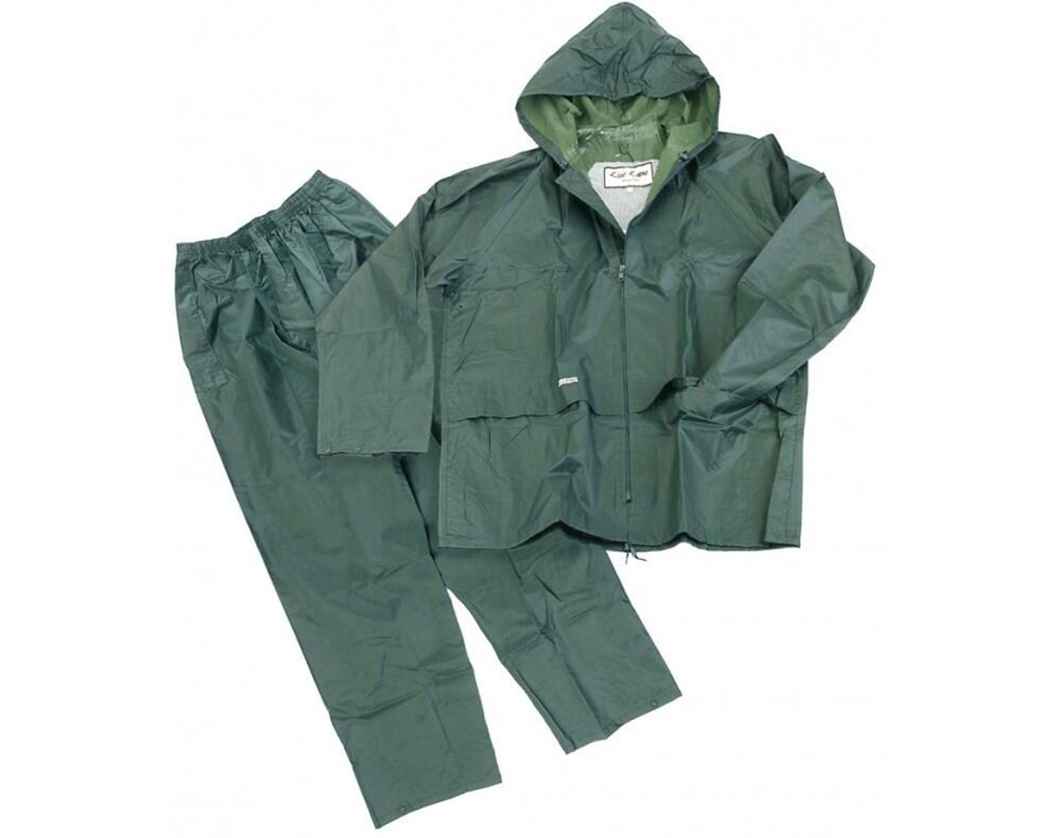 Completo impermeabile in 100% nylon pvc con termosaldatura alle cuciture. Composto da: giacca con cappuccio regolabile, due comode tasche sul davanti coperte da ampia pattina polsino interno alla manica con elastico. Chiusura centrale con zip - Pantalone lungo con elastico in vita, due tasche ai fianchi e bottoni a pressione a fondo gamba per regolazione alla caviglia.