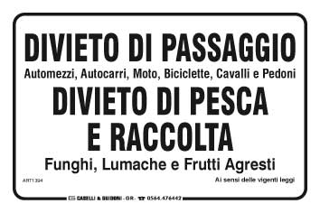 Divieto di passaggio automezzi, autocarri, moto, biciclette, cavalli e pedoni divieto di pesca e di raccolta funghi, lumache, frutti agresti.
