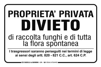 Proprietà privata divieto di raccolta funghi e di tutta la flora spontanea i trasgressori saranno perseguiti nei termini di legge ai sensi degli artt. 820 - 821 c.c., art. 624 c.p.
