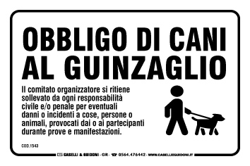 Obbligo di cani al guinzaglio Il comitato organizzatore si ritiene sollevato da ogni responsabilità civile e/o penale per eventuali danni o incidenti a cose, persone o animali, provocati dai o ai partecipanti durante prove e manifestazioni.